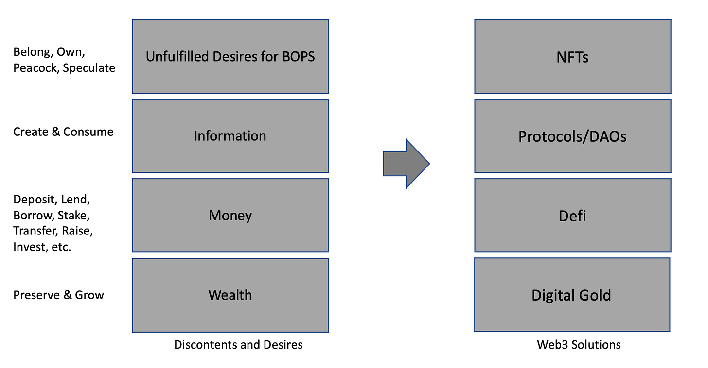 The Origins of Our Discontents deep-dives into the characteristics of the problems that Web3 wants to solve and develops a dashboard of discontents: What does not work well today and what might “better outcomes” mean for each area of discontent? I will also trace the history of the corporation, where it has caused friction and resentment, and what has led to the present moment. As Rumi once said, “Every craftsman searches for what’s not there to practice his craft.” Being precise about the problem or need is critical to know if/how a solution can address it.